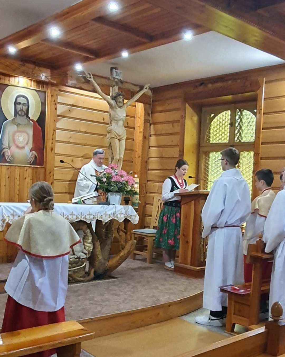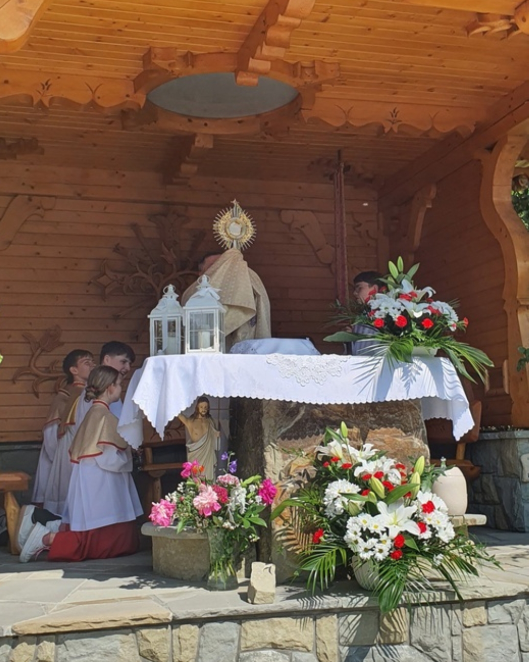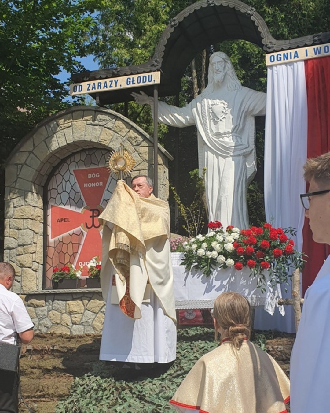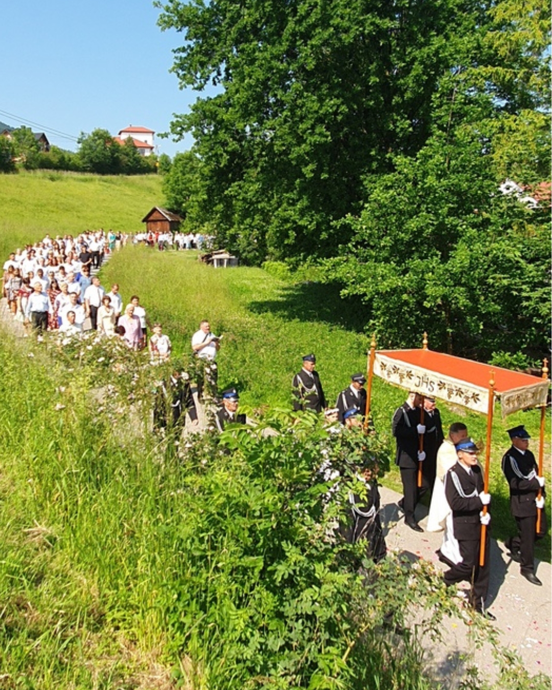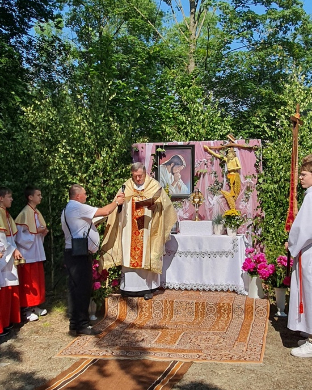 Po Mszy św. z kościoła wyruszyła procesja z Najświętszym Sakramentem do czterech ołtarzy. Przy pierwszym, usytuowanym obok kapliczki na os. Uchryny, modlono się za Kościół św., za nowego papieża Leona XIV, biskupów i kapłanów. Błagano za wszystkich chrześcijan, by zjednoczyli się przy wspólnym stole eucharystycznym. Pamiętano też o mieszkańcach tego osiedla, prosząc o obfite błogosławieństwo dla ich rodzin i w pracy.
