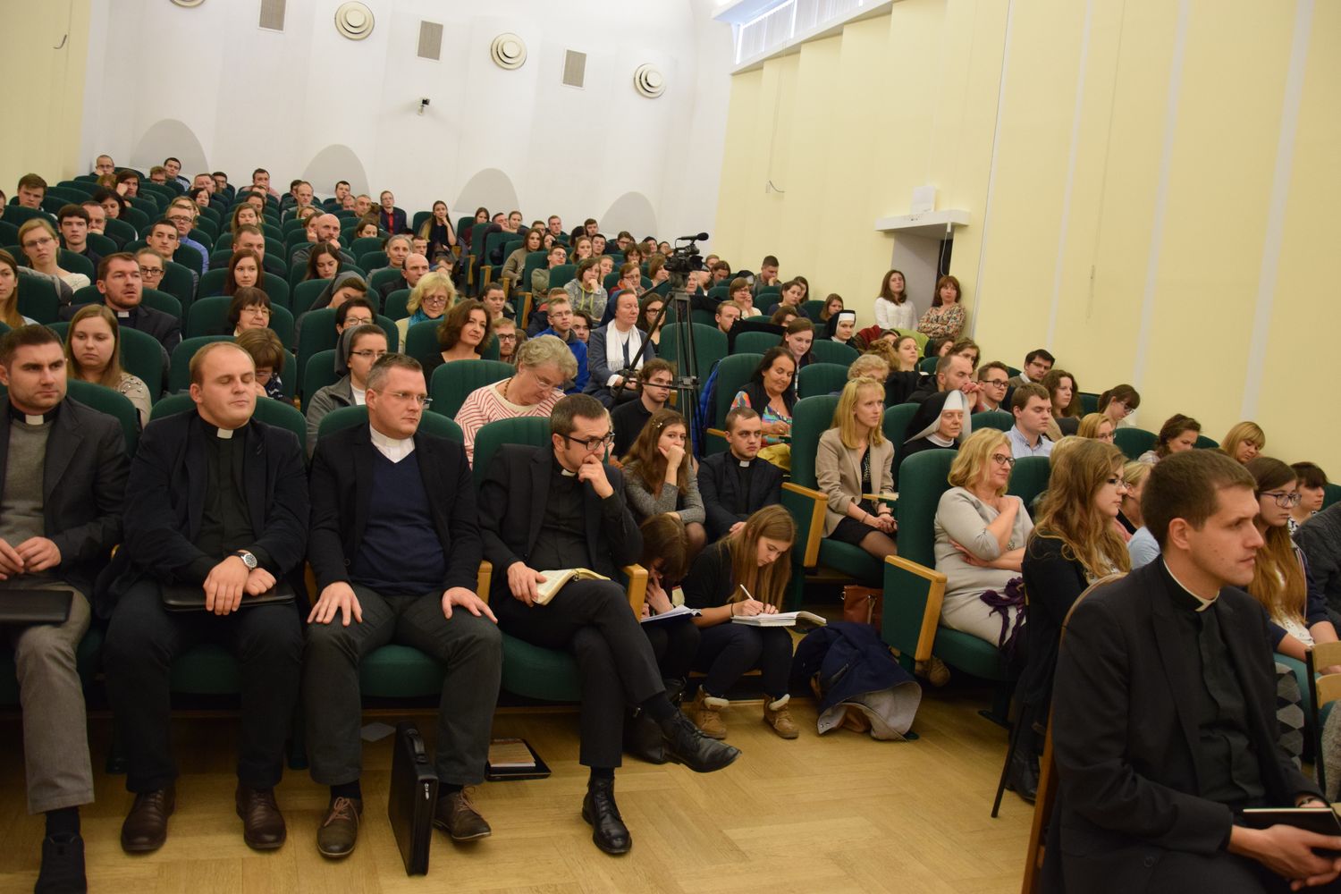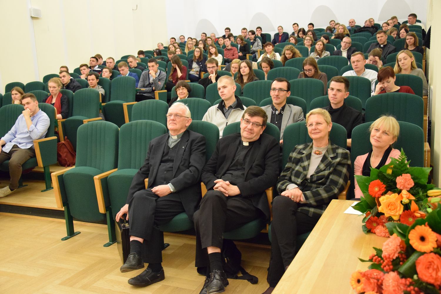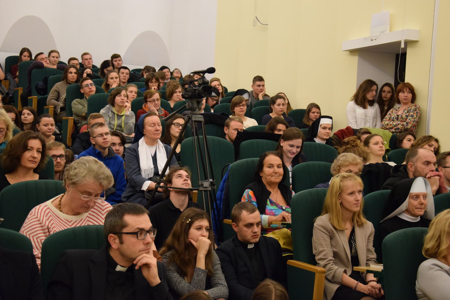Na spotkanie z biskupem Grzegorzem Rysiem przyszła tak liczna grupa słuchaczy, że aula nie była w stanie ich wszystkich pomieścić. Tematyka wystąpienia księdza biskupa skupiała się wokół wolontariatu w kontekście asertywności. „Czym jest wolontariat? Czy chrześcijanin może być asertywny”? – pytał ksiądz biskup. I odpowiadał: „W wolontariacie chodzi o wdzięczność. Kto nie ma doświadczenia obdarowania, ten nie powinien brać aktywnego udziału w wolontariacie, gdyż będzie to dla niego jedynie przygoda, bez właściwej jej głębi. Prawdziwy, chrześcijański wolontariat to nie jest tylko wypełnianie obowiązku i odpowiedź na potrzeby drugiego człowieka, ale przede wszystkim odpowiedź na swoje pragnienie znalezienia Pana Boga. Jezus sam mówi, że nie tylko kocha przybysza, ale sam jest przybyszem – bo byłem głodny, a daliście Mi jeść; byłem przybyszem, a przyjęliście Mnie” itd. „Asertywność jest przeciwieństwem miłosierdzia – kontynuował ks. Biskup Ryś – musimy wybrać miłosierdzie, które jest reakcją prawdziwie chrześcijańską, szybką i bezpośrednią. Jest troską o konkretnego bliźniego, a nie czymś ogólnym. Musimy być, jak matka, której dziecko mocno się skaleczyło. Ona, widząc to, nie buduje od razu szpitala, nie zakłada uniwersytetu, który kształci personel medyczny, ale natychmiast szuka wody utlenionej, bandaża i opatruje ranę”. Całość wystąpienie bpa Grzegorza Rysia można wysłuchać tutaj