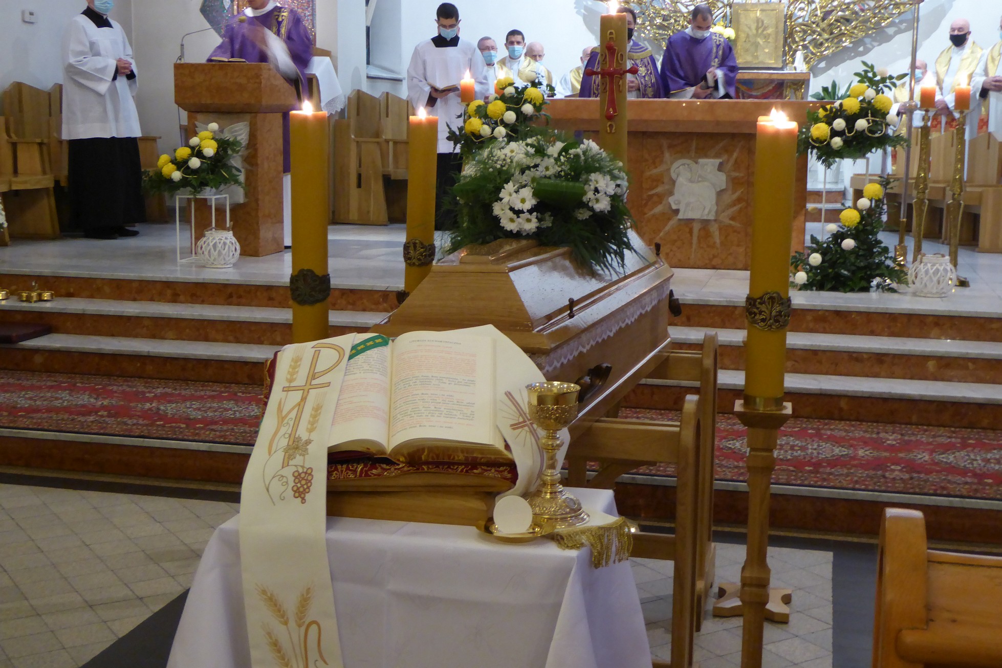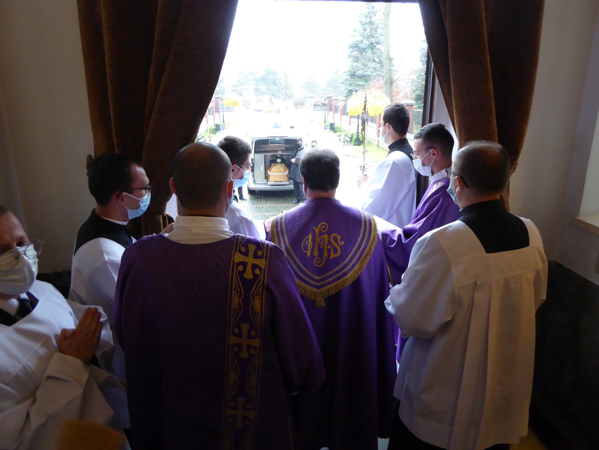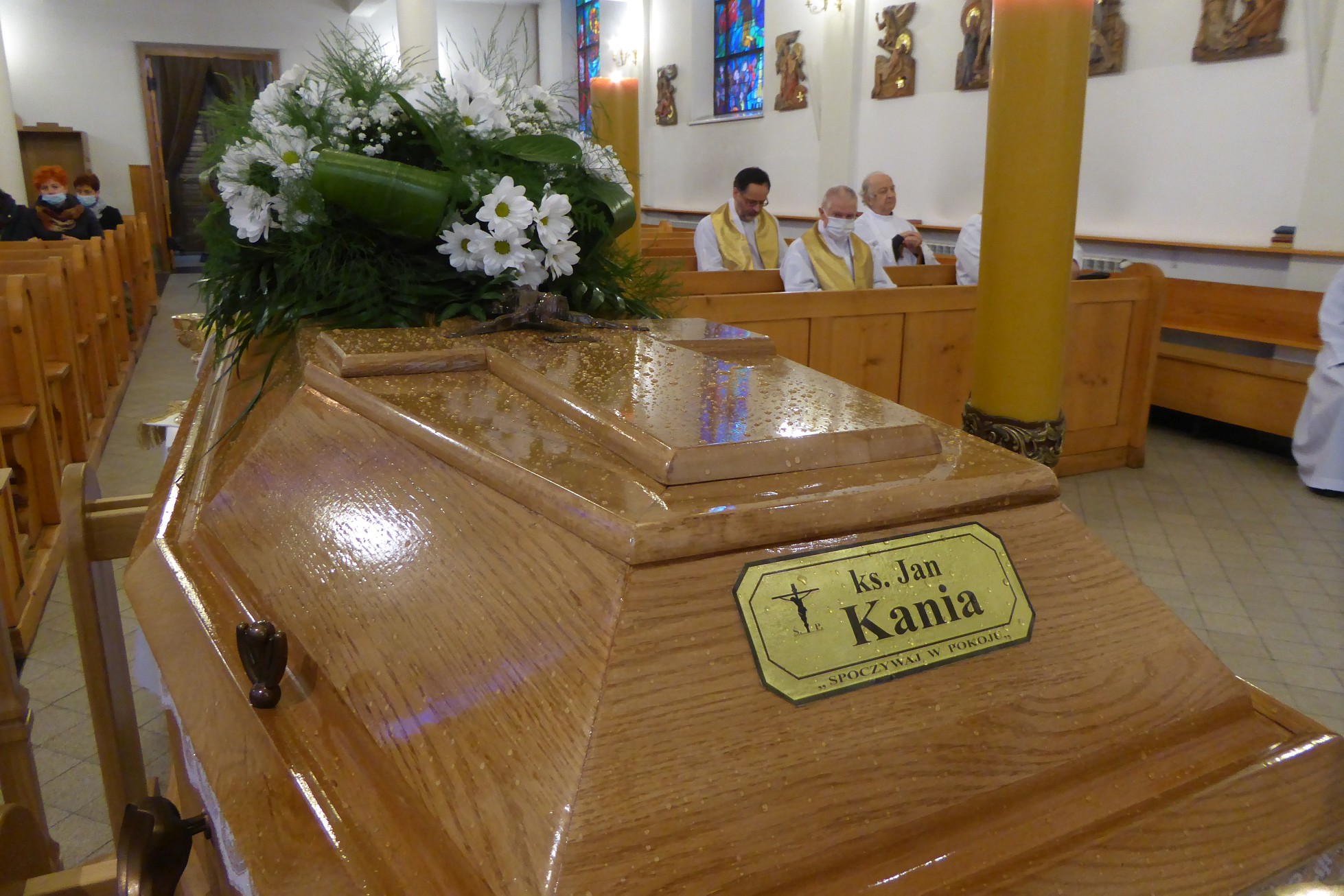 Całą ceremonię pożegnalną rozpoczęliśmy wniesieniem trumny do świątyni stadnickiej. Aktu tego dokonał ks. Janusz Bieszczad SCJ przełożony wspólnoty Kraków-Bieżanów, do której należał śp. ks. Jan Kania SCJ. Przed rozpoczęciem mszy świętej, o godz. 11:00 modliliśmy się w intencji ks. Jana rozważając tajemnice różańca świętego.