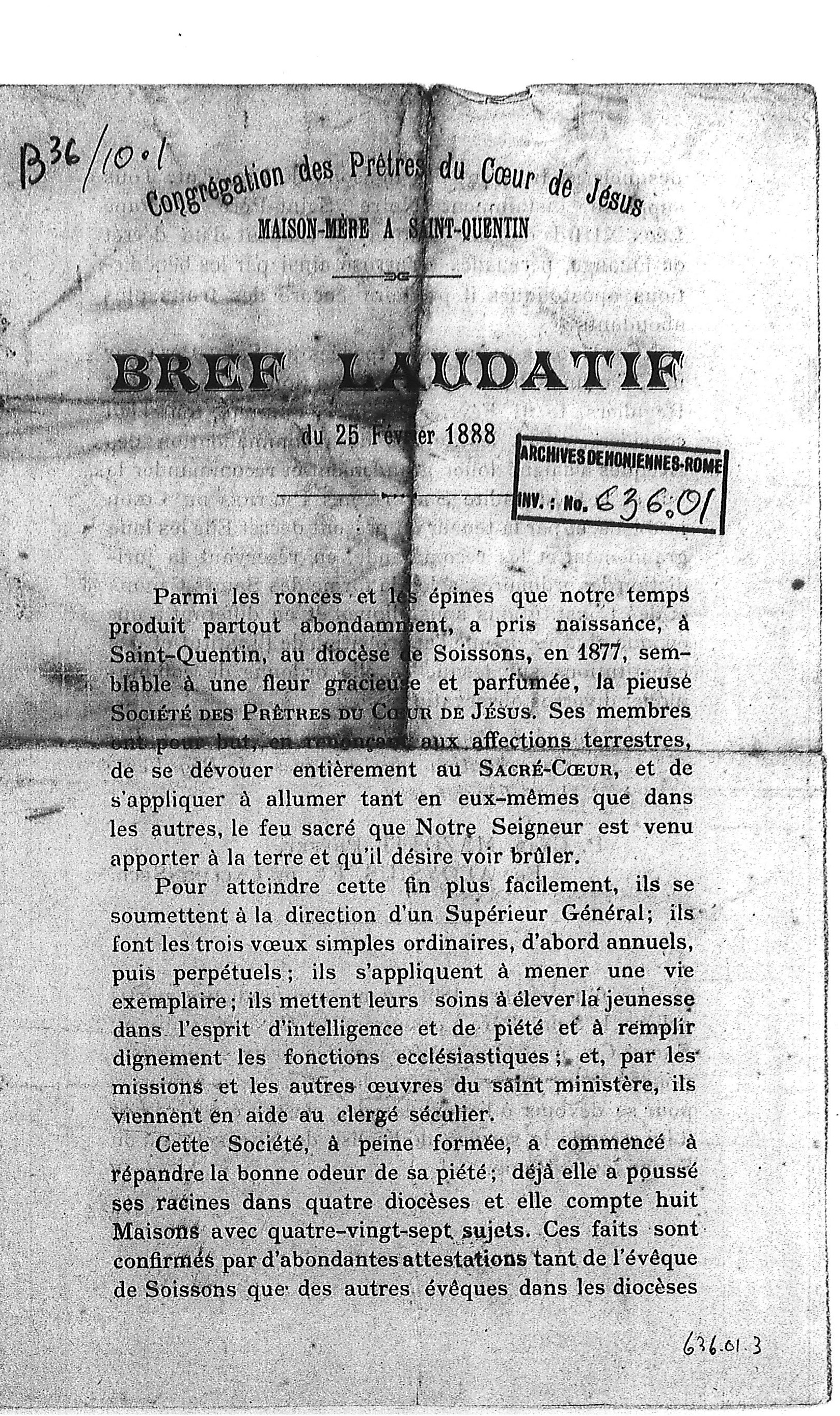 Wszystko to zostało przedstawione Ojcu Świętemu na prywatnej audiencji przez kardynała Prefekta Świętej Kongregacji Biskupów i Zakonników, 16 lutego 1888 roku. Po dogłębnej refleksji i uważnym przeanalizowaniu listów polecających, wydanych przez zainteresowanych Biskupów, Jego Świątobliwość raczył zaaprobować i wysoko ocenić cel, do którego dąży wspomniane Stowarzyszenie Księży Najświętszego Serca, pozostawiając je jednak na razie pod jurysdykcją Ordynariuszy, zgodnie z przepisami Świętych Kanonów i Konstytucji Apostolskich oraz odkładając na później zatwierdzenie samego Instytutu i Konstytucji. Jego Świątobliwość ograniczył się na razie do zalecenia, aby przekazano różne uwagi dotyczące [poprawy] Konstytucji [Instytutu].