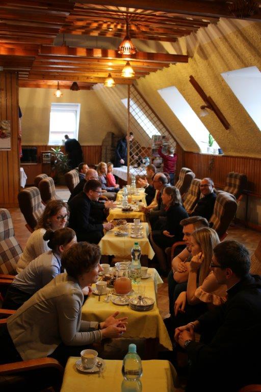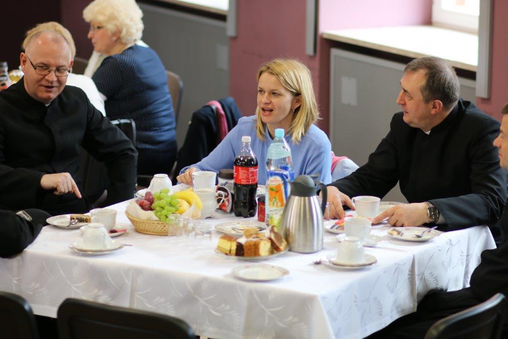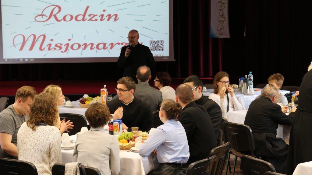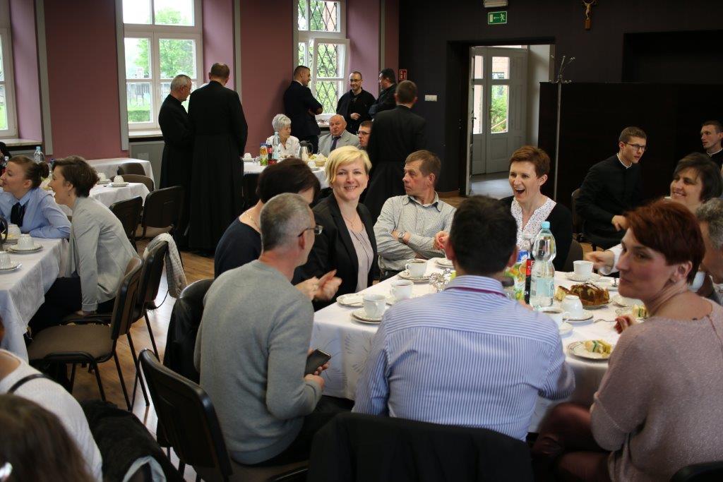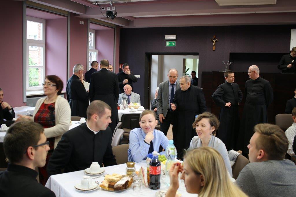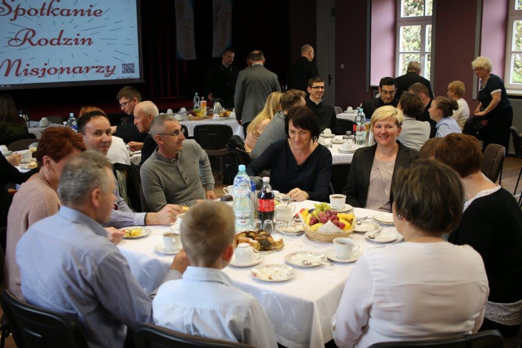Następnie goście zostali zaproszeni do refektarza na obiad, a po chwili przerwy na spotkanie „przy kawie” do auli seminaryjnej. Ostatni punkt programu okazał się być najdłuższym, bo towarzyszyło mu wiele opowieści. Najpierw księdza Chmieleckiego o tym jak narodził się projekt zbieramto.pl, dzięki któremu można pomagać misjom „bez pieniędzy”. Zostali też przedstawieni obecni na spotkaniu Darczyńcy misji: wolontariusze pracujący przy „Wakacjach z misjami i językami”, „Agentki 925”, które poświęcają wiele uwagi zbieraniu srebrnej i złotej biżuterii oraz rozprowadzaniu krzyżyków sercańskich, pani nauczycielka, która aktywnie wspiera misje dzięki projektowi szkołazmisją.pl oraz osoby, które do tej pory były znane tylko z korespondencji wychodzącej z biura Sekretariatu Misji i ich ofiar na misje przelewanych na konto bankowe, a dzięki temu spotkaniu była okazja do osobistego zapoznania się. Później głos zabrali Natalia i Damian z Krakowa, którzy opowiadali o sercańskim wolontariacie świeckich w Albanii. Na koniec państwo Paruzel z Bierunia podzielili się przeżyciami z wyjazdu do Indonezji do brata pani Renaty ks. Herberta Hensloka SCJ.