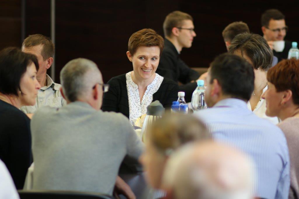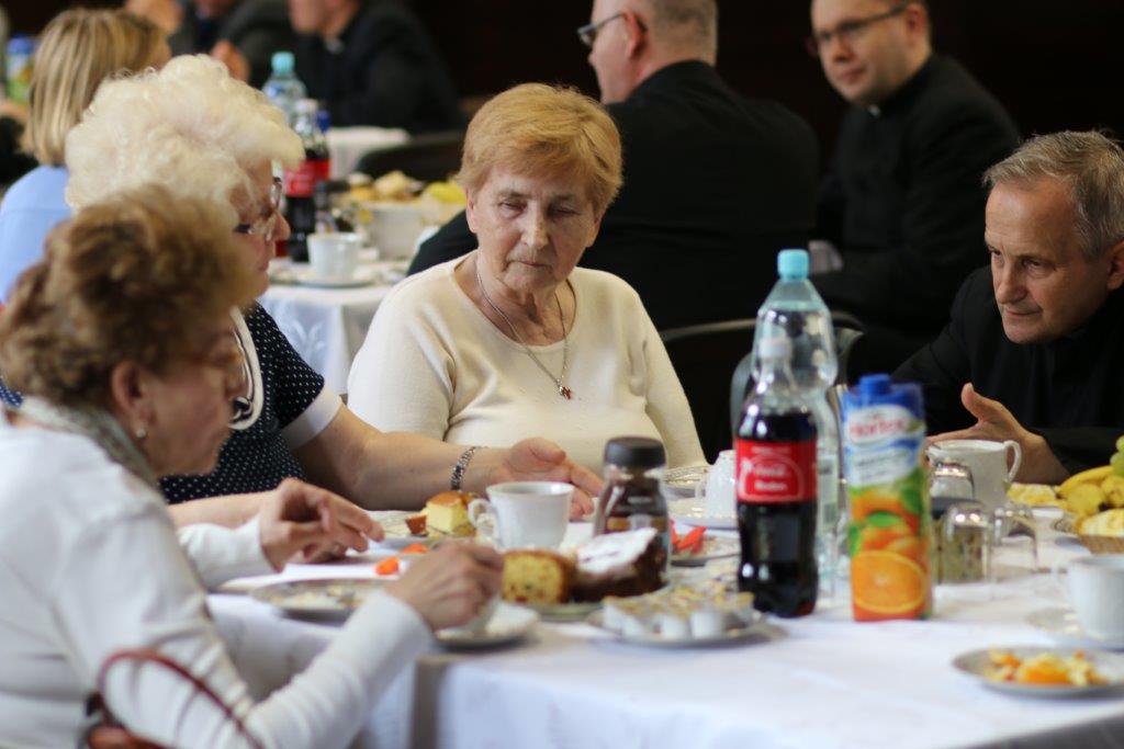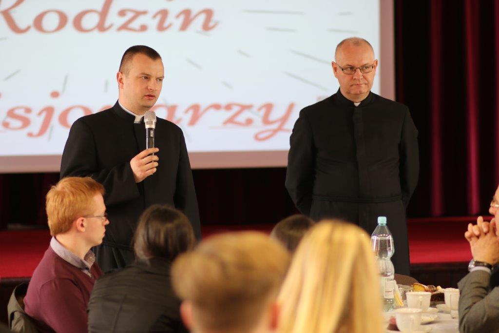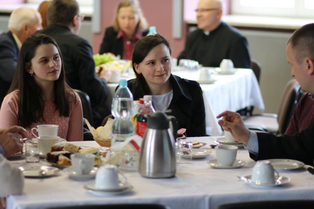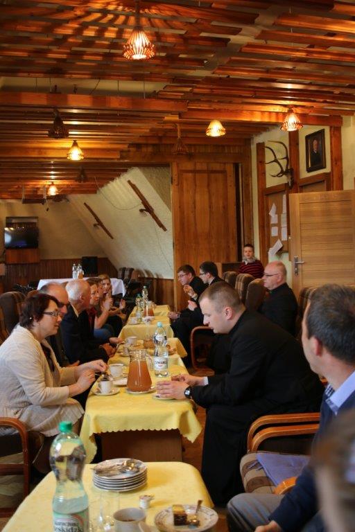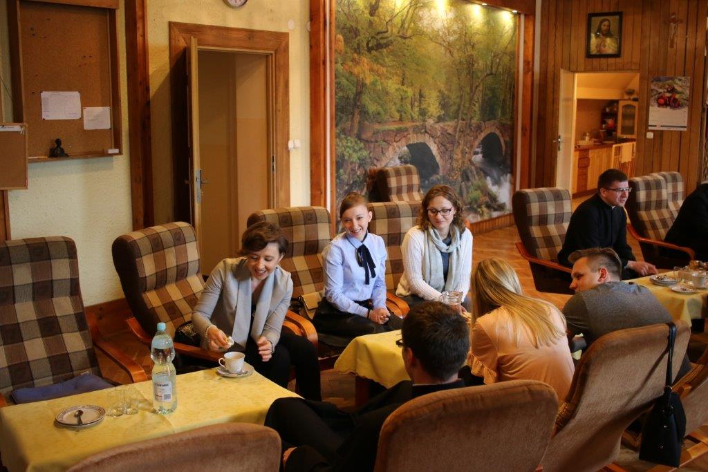 Następnie goście zostali zaproszeni do refektarza na obiad, a po chwili przerwy na spotkanie „przy kawie” do auli seminaryjnej. Ostatni punkt programu okazał się być najdłuższym, bo towarzyszyło mu wiele opowieści. Najpierw księdza Chmieleckiego o tym jak narodził się projekt zbieramto.pl, dzięki któremu można pomagać misjom „bez pieniędzy”. Zostali też przedstawieni obecni na spotkaniu Darczyńcy misji: wolontariusze pracujący przy „Wakacjach z misjami i językami”, „Agentki 925”, które poświęcają wiele uwagi zbieraniu srebrnej i złotej biżuterii oraz rozprowadzaniu krzyżyków sercańskich, pani nauczycielka, która aktywnie wspiera misje dzięki projektowi szkołazmisją.pl oraz osoby, które do tej pory były znane tylko z korespondencji wychodzącej z biura Sekretariatu Misji i ich ofiar na misje przelewanych na konto bankowe, a dzięki temu spotkaniu była okazja do osobistego zapoznania się. Później głos zabrali Natalia i Damian z Krakowa, którzy opowiadali o sercańskim wolontariacie świeckich w Albanii. Na koniec państwo Paruzel z Bierunia podzielili się przeżyciami z wyjazdu do Indonezji do brata pani Renaty ks. Herberta Hensloka SCJ.