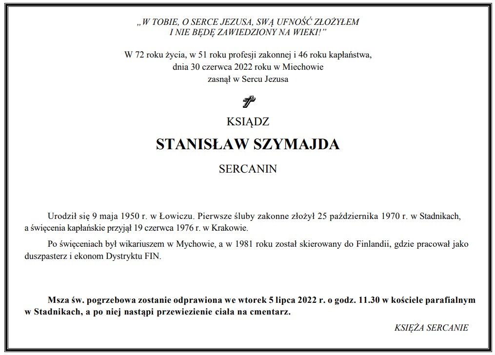 Jeesuksen pyhän sydämen pappien veljeskunnan jäsen, Kouvolan seurakunnan entinen kirkkoherra, isä Stanislaw Szymajda SCJ on kuollut. 72-vuotias isä Szymajda kuoli Puolassa Miechówin sairaalassa torstaiaamuna 30.6.2022.