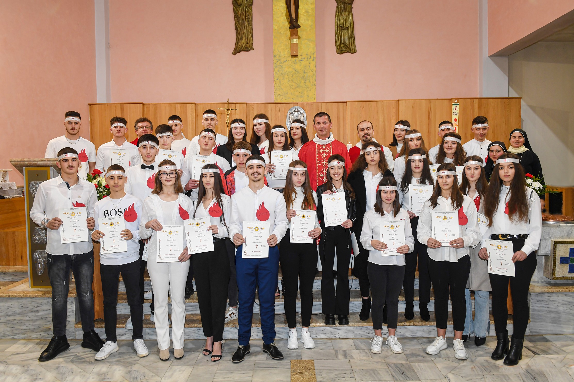 Bierzmowanie tutaj, to oprócz sakramentu także „obowiązkowy” znak Ducha świętego w postaci opaski z krzyżykiem, którą po sakramencie umieszcza się na czole bierzmowanego. Czyni to świadek, którym najczęściej jest ojciec lub matka chrzestna. Uroczystość odbyła się w atmosferze wielkiej familiarności. Czasami dochodzi też do sytuacji bardzo sympatycznych. Jednak ze świadków, gdy musiał wyjść z kościoła na początku kazania odebrać telefon, przeprosił kaznodzieję i zapewnił, że wróci, kaznodzieja oczywiście przyjął to ze zrozumieniem. Ksiądz Nikolin, wikariusz biskupi, zwykle posługuję w kościołach położonych w rejonach górskich – Dukagjin, stąd wielu z naszych parafian, zna go bardzo dobrze, i traktuje jak członka swojej rodziny.