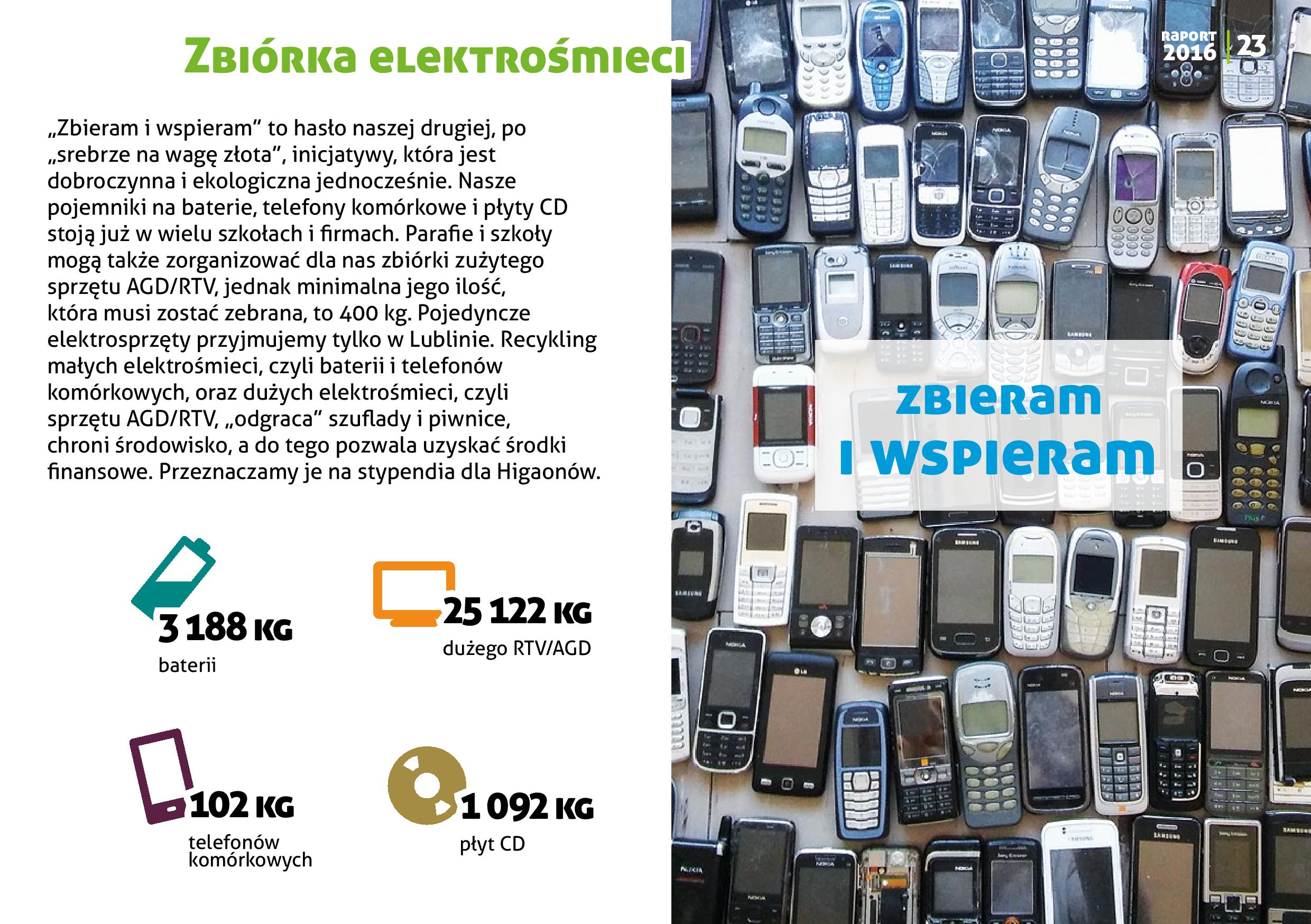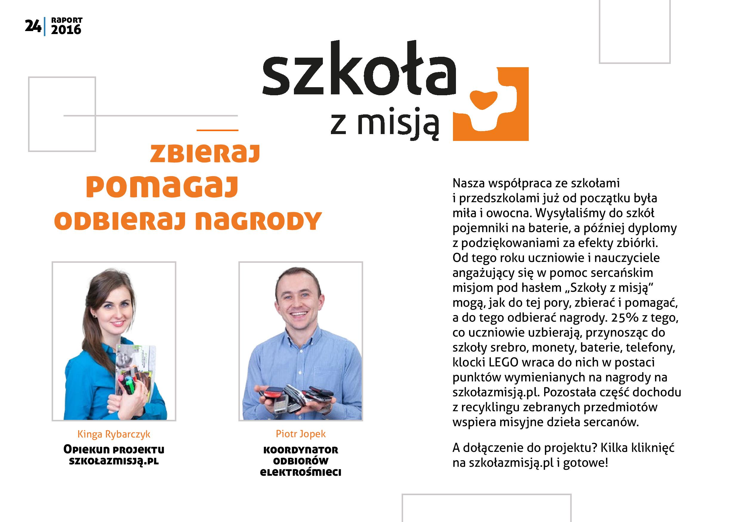 Po drugie, możemy pochwalić się również rozwojem inicjatyw „zbieraczych”. W październiku ruszyła „parafia z misją”, czyli zbiórki makulatury i innych surowców wtórnych przy kościołach. W listopadzie natomiast wystartował portal szkołazmisją. pl dedykowany naszej współpracy ze szkołami i przedszkolami z całej Polski. „Szkoły z misją” prowadzą różnorodne zbiórki przez nas proponowane. Uczymy w ten sposób dzieci i młodzież wrażliwości na środowisko naturalne i potrzeby ubogich. Ponadto szkoła czy przedszkole może odebrać nagrody w programie partnerskim.