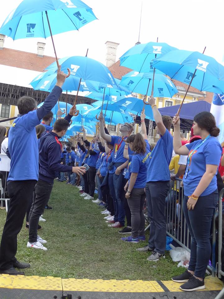 Zanim udaliśmy się na miejce wspólnej modlitwy całą grupą szliśmy ulicami miasta. Na samym początku grupy mieliśmy transparent z naszym ojcem Dehonem i symbolem sercanów i HDM (młodzież sercańska). Było pięknie!
