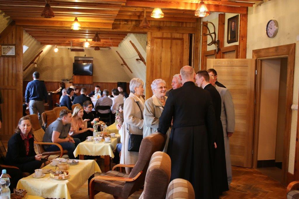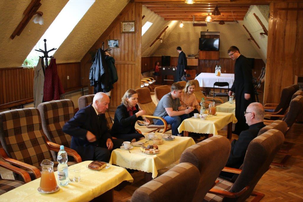 Następnie goście zostali zaproszeni do refektarza na obiad, a po chwili przerwy na spotkanie „przy kawie” do auli seminaryjnej. Ostatni punkt programu okazał się być najdłuższym, bo towarzyszyło mu wiele opowieści. Najpierw księdza Chmieleckiego o tym jak narodził się projekt zbieramto.pl, dzięki któremu można pomagać misjom „bez pieniędzy”. Zostali też przedstawieni obecni na spotkaniu Darczyńcy misji: wolontariusze pracujący przy „Wakacjach z misjami i językami”, „Agentki 925”, które poświęcają wiele uwagi zbieraniu srebrnej i złotej biżuterii oraz rozprowadzaniu krzyżyków sercańskich, pani nauczycielka, która aktywnie wspiera misje dzięki projektowi szkołazmisją.pl oraz osoby, które do tej pory były znane tylko z korespondencji wychodzącej z biura Sekretariatu Misji i ich ofiar na misje przelewanych na konto bankowe, a dzięki temu spotkaniu była okazja do osobistego zapoznania się. Później głos zabrali Natalia i Damian z Krakowa, którzy opowiadali o sercańskim wolontariacie świeckich w Albanii. Na koniec państwo Paruzel z Bierunia podzielili się przeżyciami z wyjazdu do Indonezji do brata pani Renaty ks. Herberta Hensloka SCJ.